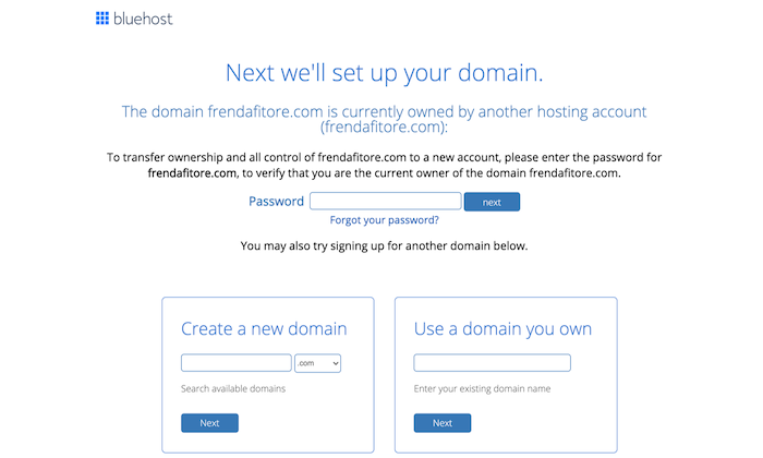 Bluehost , hız ve kesinti güvenilirliğine ek olarak, alan adının kullanılabilirliğini kontrol etmenize de olanak tanır. Şimdi kaydol sayfasını ziyaret edin ve alan adınızı kutuya girin ve işte! Bir adınız olacak.